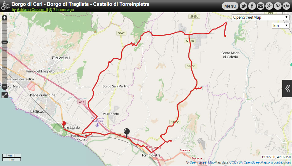 Suggestiva la vista dei borghi sulle verdi vallate e del Castello di Torreinpietra facilmente raggiungibile dall’Aurelia. Imprevisto su un inserimento per fare circa 15 km su sterrato a causa di una porzione di strada privata non percorribile.