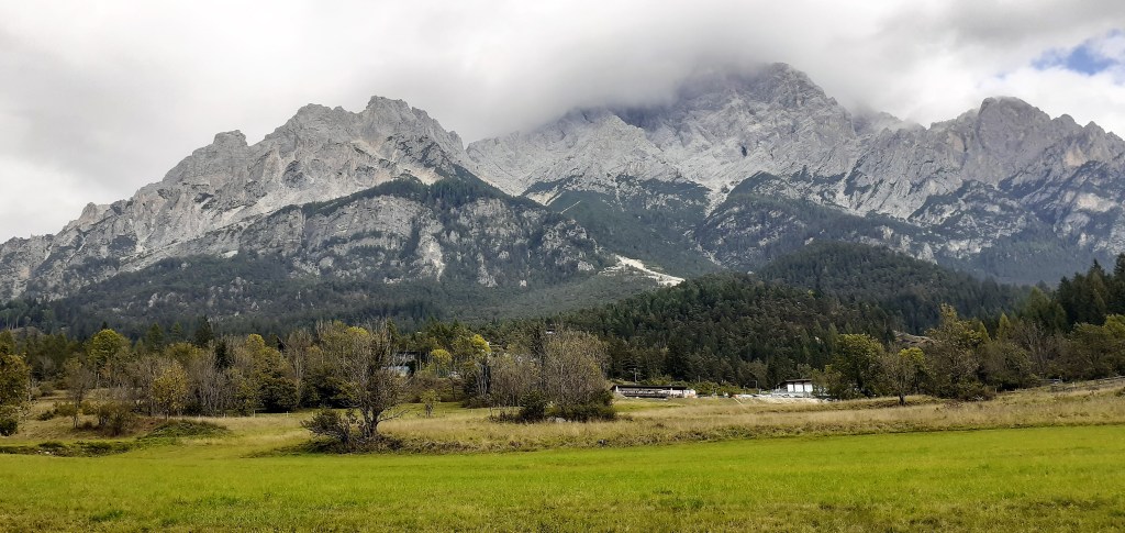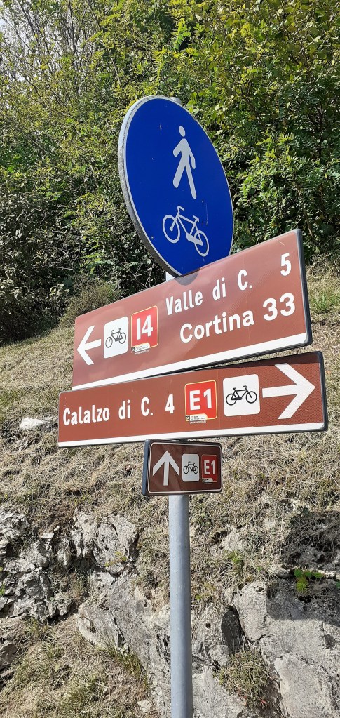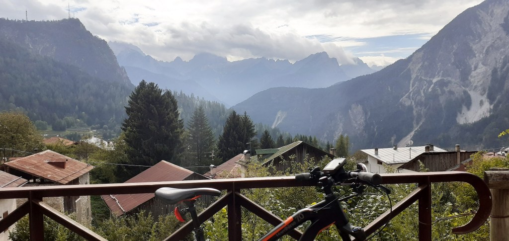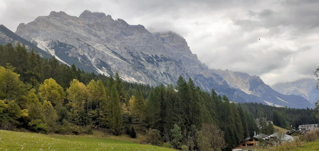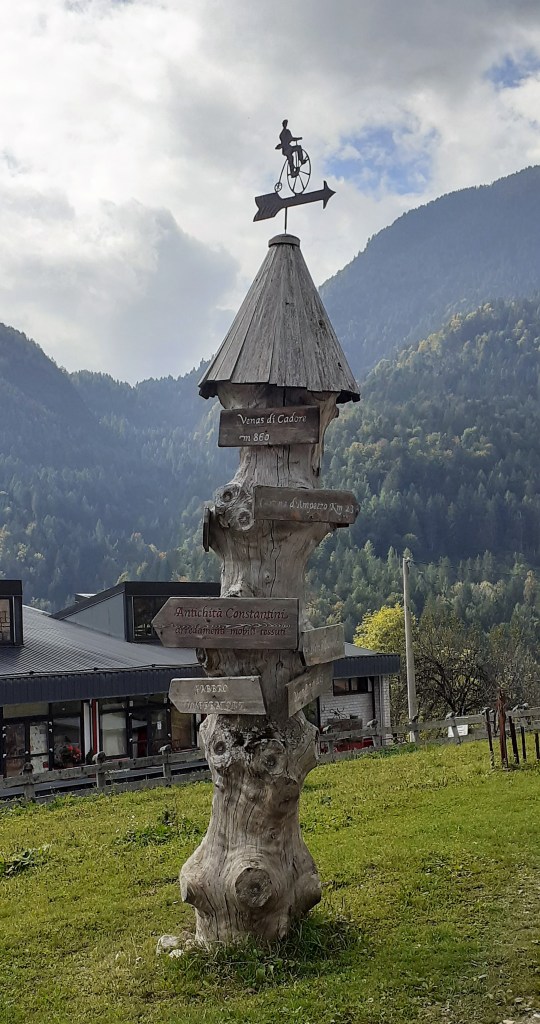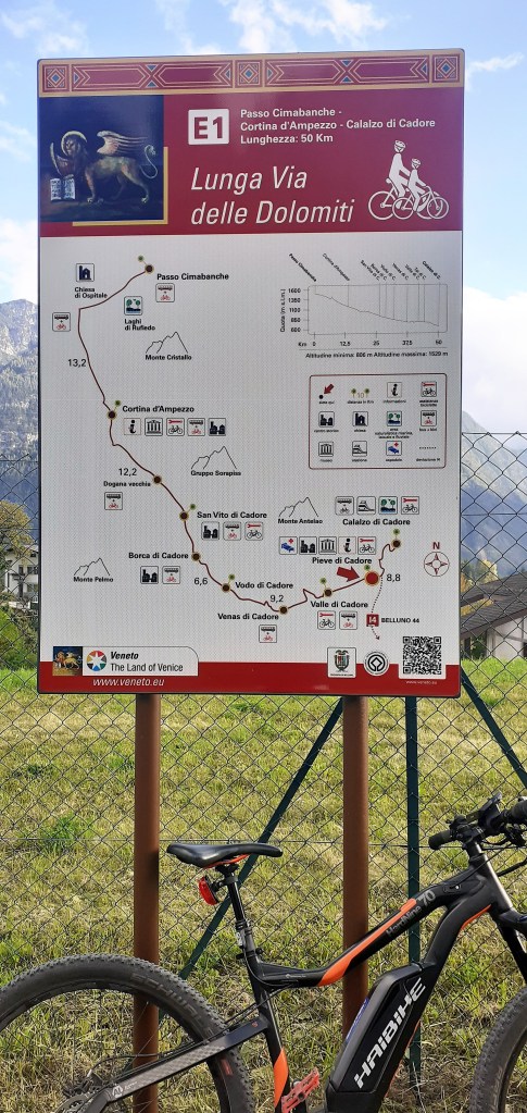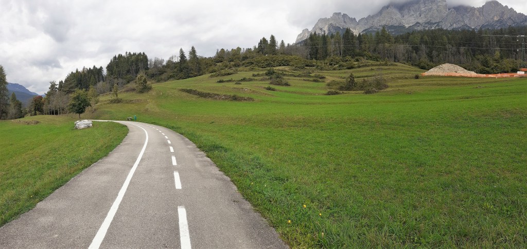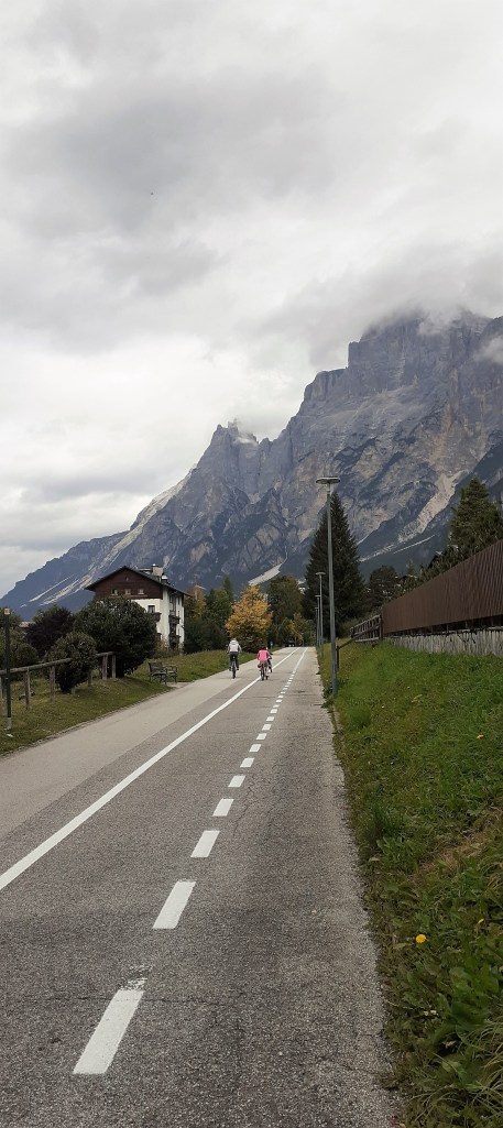 Pedalata da Calalzo di Cadore fino a Cortina d’Ampezzo e ritorno al punto di partenza a causa di un peggioramento delle condizioni metereologiche. In effetti è stato un ritorno forzato poichè la Ciclabile delle Dolomiti parte da Calalzo/Pieve di Cadore (paesini molto vicini tra loro) e termina a Dobbiaco raggiungendo il suo punto si altezza massima in corrispondenza del valico di Cimabanche dove si toccano i 1530 mt e che segna anche il passaggio dalla regione Veneto a quella del Trentino Alto Adige per poi ridiscendere nuovamente a 1200 mt. nella meta finale di Dobbiaco. In sintesi questa ciclabile si può fare in una giornata percorrendo complessivamente tra andata e ritorno 139 Km e 1250 mt. di dislivello totale che sarebbe stato appunto lo scopo della mia uscita, interrotta mio malgrado dal cattivo tempo . Partendo quindi dalla stazione del treno di Calalzo si sale rapidamente da 730 mt. a 810 mt. in meno di 1 km e ci si immerge subito nella vista spettacolare delle Marmole, montagne altissime sulla Conca di Cadore ma che vedro’ spesso lungo questo tracciato prima di arrivare a Cortina e che attraverserà tanti paesini come Valle/Venas di Cadore, Peaio, Vodo/San Vito di Cadore, Dogana Vecchia (piccola cittadina che fino alla fine della prima guerra mondiale segnava il confine tra il Regno d’Italia e l’Impero Austro-Ungarico) e Zuel.